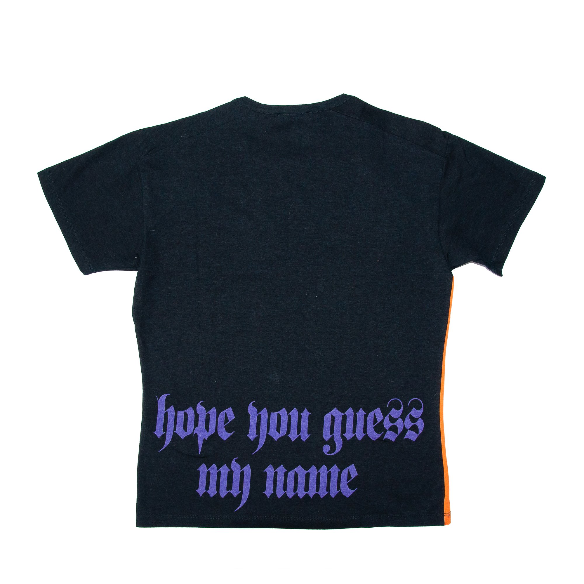 The backside of the garment also features gothic font that reads 'Hope you guess my name'.